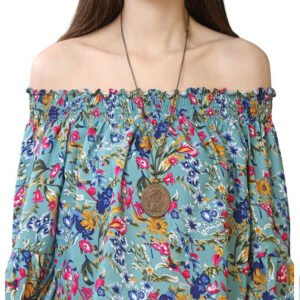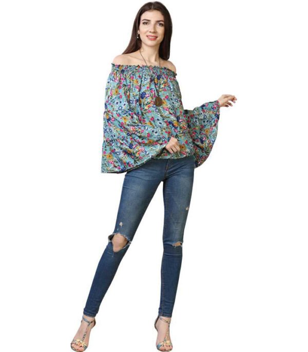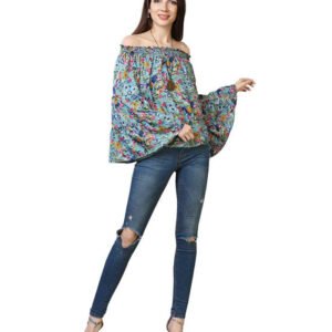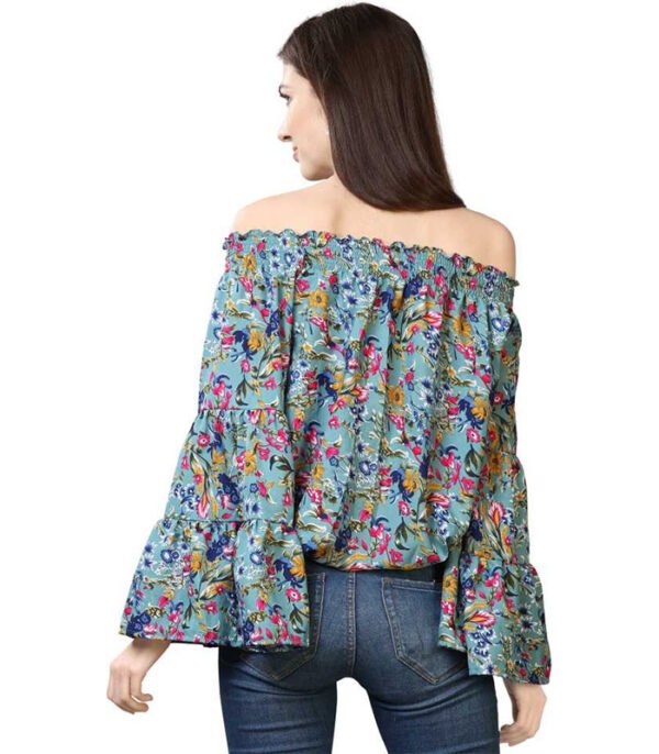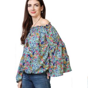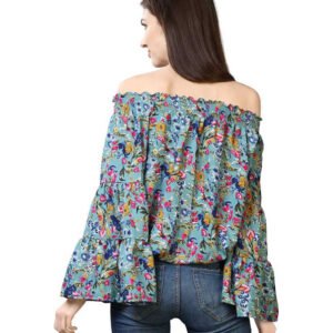 Top Style: Smocked off shoulder top with tiered bishop sleeves and scrunched up hip. Fabric Style: Floral printed fabric. Styling Tip: Can be be styled both as a formal work outfit and a playful party outfit.. Garment Fit: Garment is made with relaxed fit. . Fabric Type: Garment is made of crepe, which drapes well on all body types. Wash Care: First Wash Dry Clean, thereafter Hand wash